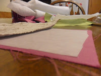 Next, I cut out the lining to the same size as my green out fabric. (Make sure you make it strait as this was where most of my measurements where off.) Then I fused the lining to it and pinned the batting to that.
